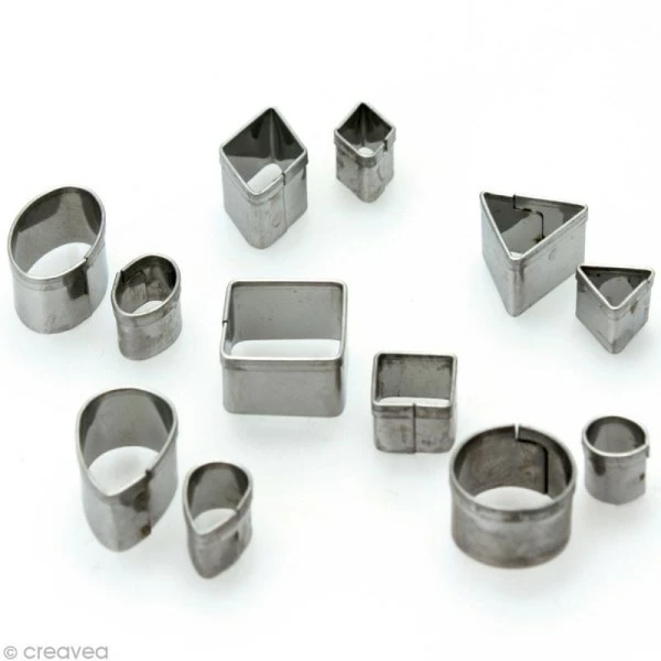 Ce lot de 12 emporte pièces pour pâte polymère est un basique pour toutes les fimoteuses ! Ces découpoirs de petite taille vous serviront pour tous vos projets de miniatures et de bijoux. Les formes sont des classiques du modelage en pâte fimo ou Sculpey: losange, carré, rond, etc. Chaque modèle est décliné en 2 tailles: 5 mm et 20 mm; parfait pour donner un effet de volume ou réaliser de tout petits objets. Ils vous rendront un grand service en donnant une forme régulière et nette à votre pâte fimo !