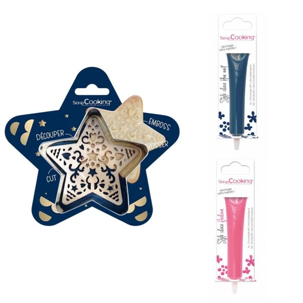 Description de Kit pour biscuit en relief Étoile + 2 Stylos au chocolat bleu nuit et fuchsia