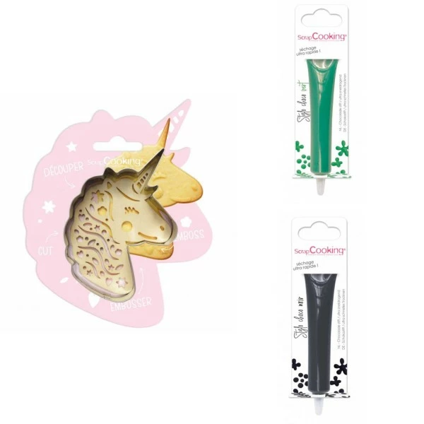 Description de Kit pour biscuit en relief Licorne + 2 Stylos au chocolat vert et noir